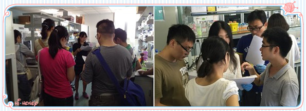收集好血液樣本后, 每個小組根據(jù)protocol開始實驗操作,指導(dǎo)人員對關(guān)鍵步驟進(jìn)行說明并進(jìn)行演示,如加樣,溶紅,加抗體混勻,洗滌,避光孵育等步驟。