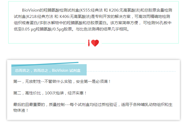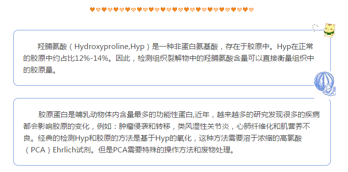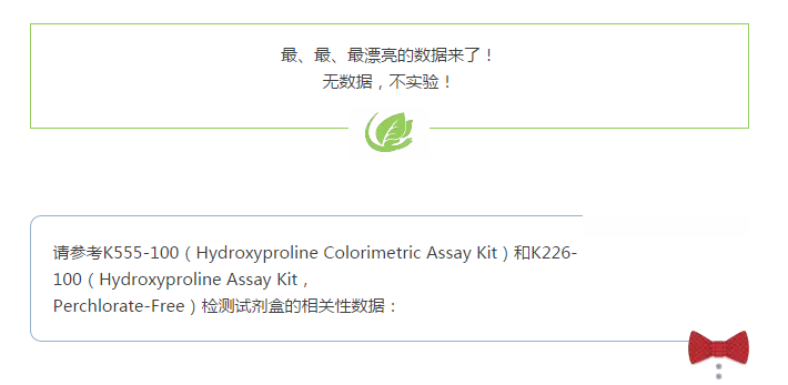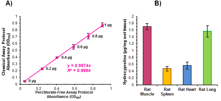 Figure (A). 經(jīng)典高氯酸法檢測的試劑盒(k555-100)和無高氯酸法檢測試劑盒(k266-100)的標準曲線之間的相關(guān)性比較。數(shù)據(jù)顯示此兩種檢測方法具有非常好的相關(guān)性(R2 > 0.999)。 (B). K266-100試劑盒檢測大鼠樣本中的總羥脯氨酸的含量。