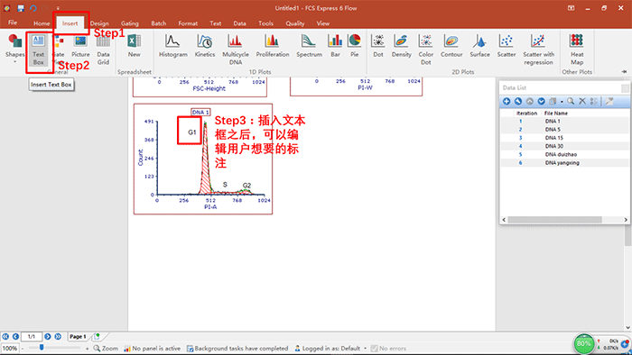 b.將細胞周期分析的模板調出來之后,點擊OK,會彈出如下圖所示的界面,然后可以利用insert按鈕,插入文本框,從而可實現(xiàn)圖注的編輯,如下圖所示(我們可以對圖中的每個峰進行命名,從而可以對細胞周期中的各個時期進行命名和解釋):
