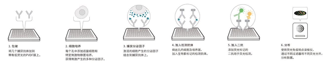 相比于ELISpot,F(xiàn)luoroSpot依舊維持了ELISpot的高靈敏度,還能對單細胞分泌的多種細胞因子同時進行檢測,從而實現(xiàn)細胞亞群的鑒定和細胞多功能性分析。