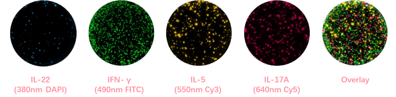 該圖為Mabtech FluoroSpot Plus: Human IL-22/IFN-γ/IL-5/IL-17A(Cat#FSP-18010803-2)的實驗結果,四個檢測通道對應的DAPI,F(xiàn)ITC,Cy3,Cy5。