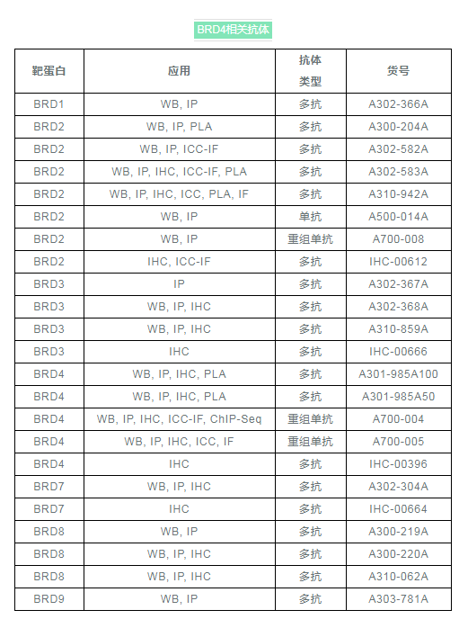 Bethyl認識到BRD4在細胞周期調(diào)控和腫瘤發(fā)生中的重要性,研發(fā)了質(zhì)量優(yōu)秀的BRD4抗體,以及許多其他相關(guān)蛋白質(zhì)的抗體,以促進癌癥研究發(fā)展。
