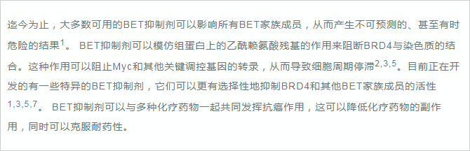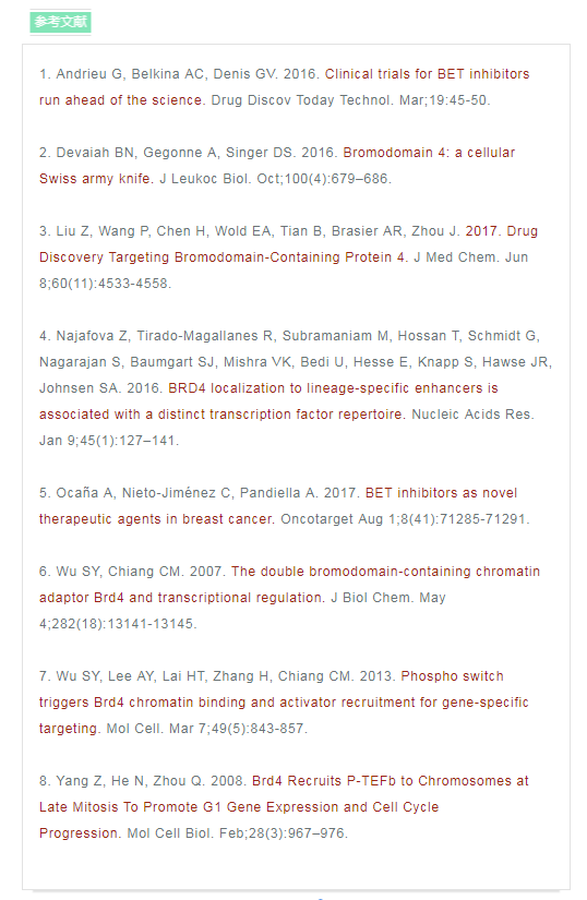 BRD4(溴結(jié)構(gòu)域蛋白4)是一種轉(zhuǎn)錄調(diào)節(jié)因子。研究發(fā)現(xiàn),BRD4在癌癥、自身免疫和炎癥性疾病中具有重要的作用1,2。 正常生理情況下,BRD4主要參與細胞周期過程中的基因表達調(diào)控,其可以與乙?;旧|(zhì)結(jié)合,保持各種基因在細胞分裂循環(huán)過程中的穩(wěn)定表達 ,這種現(xiàn)象被稱為表觀遺傳記憶或基因轉(zhuǎn)錄的“書簽”2,7。 同時,BRD4在調(diào)控分化和發(fā)育中也起著關(guān)鍵作用2,4。 如果BRD4缺失,骨髓干細胞將不能分化成為B和T細胞2。 BRD4亦是MEFs或B細胞重編程為誘導(dǎo)多能干細胞過程中重新表達干細胞基因所必需的,在成骨細胞分化過程中BRD4也發(fā)揮重要作用。 綜上,BRD4在細胞周期調(diào)控和分化中的重要作用使其成為癌癥和免疫系統(tǒng)疾病的新興治療靶點。