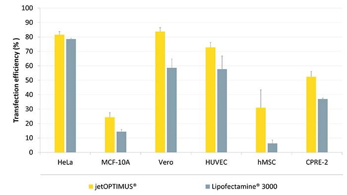 △圖1. jetOPTIMUS?有效提高難轉(zhuǎn)細(xì)胞的轉(zhuǎn)染效率。根據(jù)L3K和jetOPTIMUS?說明書要求進(jìn)行轉(zhuǎn)染,在24孔板中轉(zhuǎn)染GFP質(zhì)粒到多種細(xì)胞系,24小時后采用FACS檢測轉(zhuǎn)染效率。