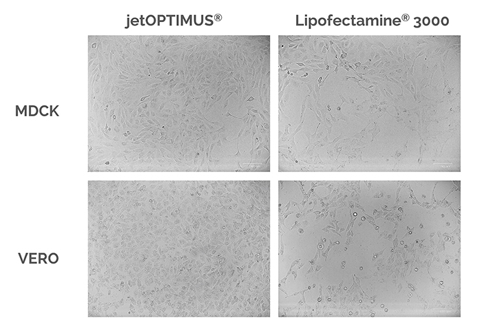 △圖2. 使用jetOPTIMUS?轉(zhuǎn)染24小時后,細(xì)胞仍然健康并保持良好形態(tài)。根據(jù)L3K和jetOPTIMUS?說明書要求進(jìn)行轉(zhuǎn)染,24小時后在相差顯微鏡下觀察MDCK和VERO細(xì)胞的狀態(tài)。