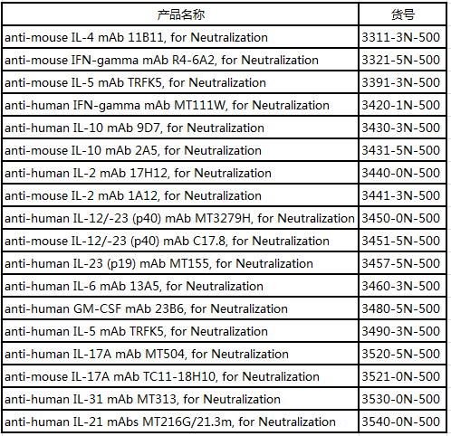 Mabtech除了ELISpot、ELISA相關(guān)檢測產(chǎn)品外,還提供人、小鼠等多種指標(biāo)的中和抗體;并且Mabtech的中和抗體均為單克隆抗體,不含疊氮化鈉,且內(nèi)毒素含量均低于10 EU/mg。