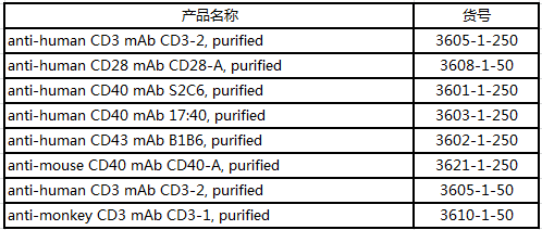 此外,Mabtech還推出了能夠刺激T、B細(xì)胞激活的抗體,如:Anti-CD3可作為T細(xì)胞多克隆活化劑;Mabtech提供了人和猴的CD3單克隆抗體,它能激活多種細(xì)胞因子的釋放,包括IFN-γ、IL-2、IL-4、IL-5、IL-10、IL-13和IL-17A。