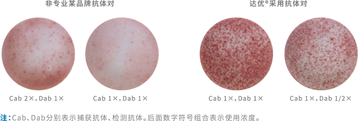 為實現(xiàn)ELISPOT檢測的高靈敏度,所用的信號放大系統(tǒng)——酶,要求純度高,催化反應轉(zhuǎn)化率高、專一性強、性質(zhì)穩(wěn)定,制成的酶標抗體也必須是性質(zhì)穩(wěn)定,且繼續(xù)保留活性部分和高效催化能力。對國際上不同公司開發(fā)的最新通用性高效酶標抗體進行對比性篩選試驗,一直作為達優(yōu)?系 列產(chǎn)品質(zhì)控及品質(zhì)升級的一項重要工作持續(xù)進行,其首要目的就是保持試劑盒采用最佳的酶聯(lián)信號放大系統(tǒng),達到最佳檢測效果。