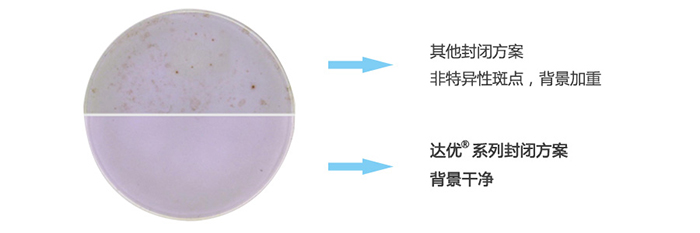 不同的檢測樣本在板孔培養(yǎng)過程中,受各種實驗條件影響,如果封閉不當都可能產(chǎn)生非特異性顯色,導致非特異性斑點的產(chǎn)生或者背景顏色的加重。這將直接影響到最后結果的判斷分析。達優(yōu)?系列產(chǎn)品通過大量實驗,對不同來源、不同配方封閉方法進行封閉效果的對比試驗,篩選出更高效的封閉系統(tǒng),并將之運用到系列試劑盒產(chǎn)品中。