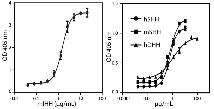 C3H10T1/2干細(xì)胞培養(yǎng)至細(xì)胞融合,使用BMP-9(20 ng/mL, Cat. No. 553102)和不同濃度的h/mSHH、或hDHH、或mIHH(Cat. No. 753502, 754602, 759802,758602)處理,將間充質(zhì)干細(xì)胞誘導(dǎo)分化為成骨細(xì)胞。使用對(duì)硝基苯磷酸酯作為底物,檢測(cè)成骨細(xì)胞標(biāo)記物堿性磷酸酶。