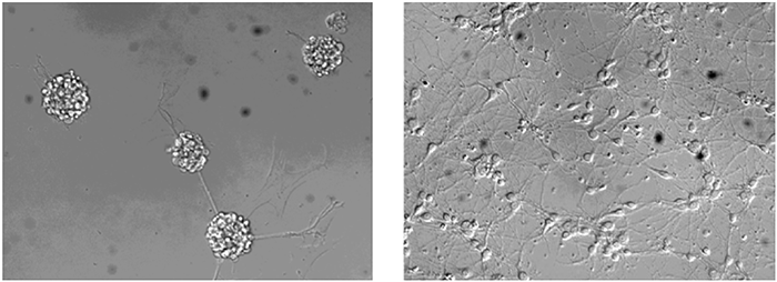 人Midkine增強(qiáng)了培養(yǎng)三天的大鼠胚胎(E18)皮層神經(jīng)元的神經(jīng)突起生長(zhǎng);左(未處理),右(0.4 μg/mL的人Midkine)