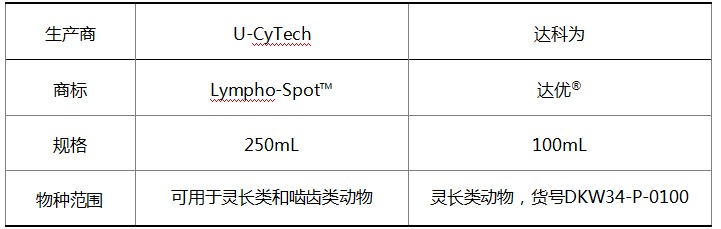 目前,我們同時提供U-CyTech原產(chǎn)的Lympho-Spot?無血清培養(yǎng)基和U-CyTech授權(quán)達(dá)科為在國內(nèi)生產(chǎn)的達(dá)優(yōu)?無血清培養(yǎng)基。它們的原料來源與質(zhì)控標(biāo)準(zhǔn)完全相同,能獲得同樣出色的檢測結(jié)果。由于物種的差異,部分添加成分在靈長類和嚙齒類之間有差別。U-CyTech公司采取了同時添加的策略,所以生產(chǎn)出的是通用達(dá)優(yōu)?無血清培養(yǎng)基;達(dá)科為公司采取的是分別添加的策略,所以生產(chǎn)出的是專用達(dá)優(yōu)?無血清培養(yǎng)基,分靈長類和嚙齒類兩個品種。詳細(xì)的差別見下表。