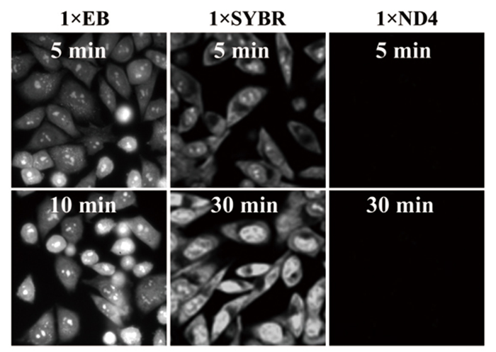 在37℃條件下,HeLa細胞在1×EB、1×SYBR和1×ND4,分別孵育5min、10 min或30 min。