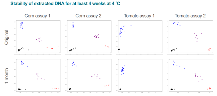 △圖2. 用QuickExtract從玉米和番茄中提取的DNA用KASP基因分型技術(shù)進(jìn)行聚類(Original),然后在4℃下儲存1個月,再將樣品進(jìn)行聚類(1month) ,實驗結(jié)果完全一致。