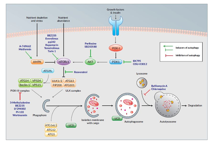 自噬是原生分解程序,由細胞內(nèi)應(yīng)激物(營養(yǎng)物和能量貧乏)引起。自噬由生成自噬體開始,這一步驟由一系列蛋白調(diào)控,包括VPS34的Ⅲ型磷脂?;迹?/span>PI)3激酶復(fù)合體,隨后與溶酶體的融合將自噬體酸化。自噬的阻斷有多種形式,例如Ⅲ型PI3激酶抑制劑可通過抑制自噬捕獲動作而阻斷自噬進程,或者用抑制溶酶體酸化的抑制劑阻止自噬溶酶體的形成和自噬降解。自噬進程是被縝密調(diào)控的。mTORC1,一種對營養(yǎng)物和生長因子敏感的激酶,是自噬的主要阻遏器。因此,mTORC1及其信號通路的抑制劑可誘導(dǎo)產(chǎn)生自噬。