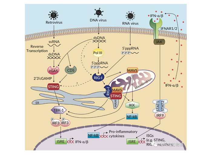 感受器cGAS和RIG-I通過單獨(dú)的接頭蛋白來(lái)識(shí)別不同的核酸和信號(hào)。cGAS感受細(xì)胞質(zhì)中異常DNA的存在和濃度,而后通過環(huán)二核苷酸2’3’-cGAMP[2]募集干擾素基因刺激因子(STING, or MITA/ERIS/MPYS)。RIG-I檢測(cè)出5`-二/三磷酸末端未加帽的病毒RNA和短平末端雙鏈部分的病毒RNA后,其與線粒體抗病毒信號(hào)蛋白(MAVS, or IPS-1/VISA/Cardif)[1]結(jié)合。它們激活后,cGAS/STING和RIG-I/MAVS將觸發(fā)共同的信號(hào)級(jí)聯(lián)反應(yīng)導(dǎo)致I型干擾素(IFNs)和促炎性因子的產(chǎn)生。
