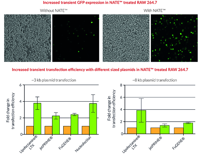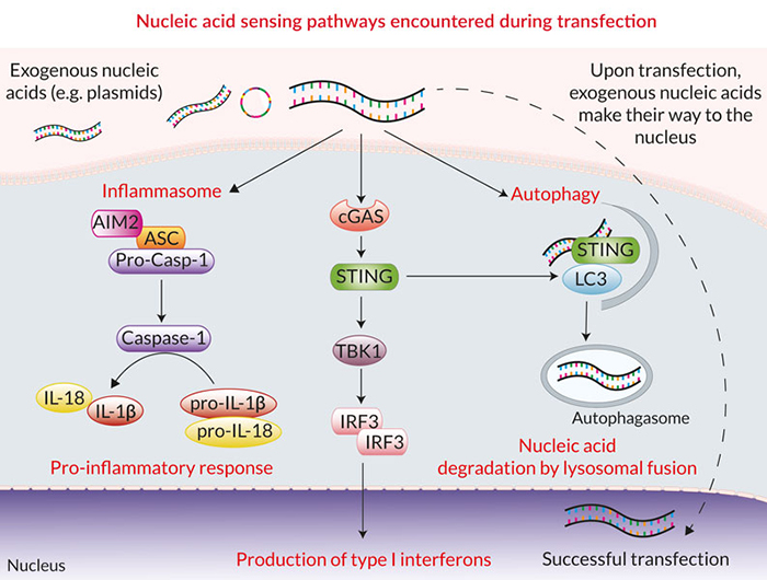 在真核細(xì)胞轉(zhuǎn)染期間,外源核酸(如質(zhì)粒DNA)的主要障礙是它們會(huì)被胞質(zhì)傳感器檢測,如cGAS/STING,AIM2炎癥小體和LC3介導(dǎo)的自噬。這些防御性級聯(lián)信號的激活通常會(huì)導(dǎo)致低轉(zhuǎn)染效率、降低的細(xì)胞活力和不一致的結(jié)果,尤其是在難轉(zhuǎn)細(xì)胞(如免疫細(xì)胞)的轉(zhuǎn)染實(shí)驗(yàn)中。NATE?抑制許多核酸感應(yīng)途徑,從而保護(hù)外源DNA并促進(jìn)其表達(dá)。