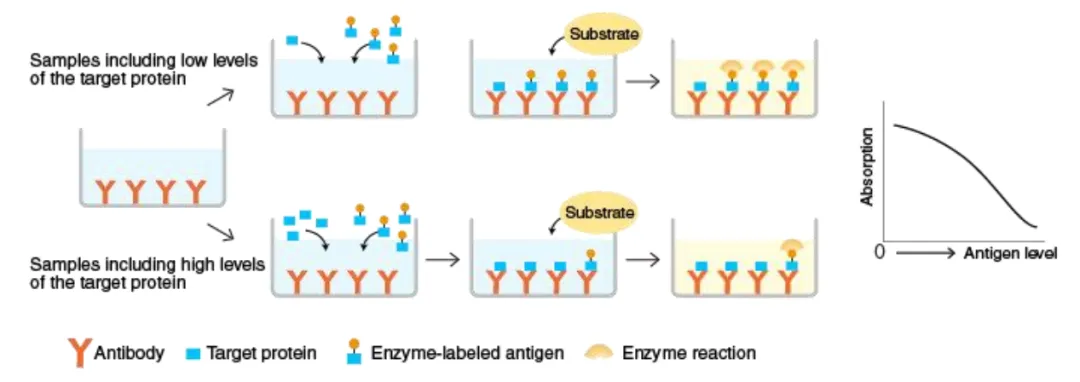 1、樣本中分析物水平較低可以使用哪些方法改進檢測?通過增加洗滌次數(shù)和兩次洗滌之間的浸泡時間降低背景。控制測定精確度。例如,在移液時要更加小心和一致,使用干凈的紙巾拍板,以避免污染。增加孵育時間。但這通常也會增加背景,因此檢測靈敏度不一定會增加。如果可以的話,建議濃縮樣本。使用5-PL曲線擬合方法,更準確地計算標準曲線下端的樣本濃度。在大多數(shù)情況下,樣本可能只含有非常低或無法檢測到的分析物水平。這時無論如何操作和測定,仍然無法檢測到準確濃度。2、包板應如何存放?如果包被完抗體的板不能立即使用,應將其密封并在4°C儲存過夜。3、為什么使用同一克隆號的捕獲抗體和檢測抗體建立ELISA實驗沒有成功?如果使用相同的克隆抗體進行檢測和捕獲,則抗原表位可能已經(jīng)被其中一種抗體占據(jù)并抑制另一抗體結合。建議捕獲和檢測抗體選擇不同的克隆號。4、應該使用哪種包被緩沖液?一般來說,建議使用PBS(pH 7.4)或碳酸鹽緩沖液(pH 9.5)。確切的包被緩沖液可能取決于要檢測的細胞因子。5、為什么細胞因子流式染色與ELISA測定之間沒有良好的相關性?流式細胞術檢測的胞內(nèi)細胞因子代表檢測時的陽性細胞比例,ELISA代表細胞因子隨時間的積累量??赡苌倭康年栃约毎谝欢螘r間之后會分泌大量的細胞因子于培養(yǎng)上清中,導致ELISA的結果與胞內(nèi)因子染色的結果不一致6、可以使用細胞培養(yǎng)板進行ELISA實驗嗎?不可以。細胞培養(yǎng)板設計用于達到細胞培養(yǎng)目的,通常不具有高蛋白結合能力。對于ELISA,建議使用具有高蛋白結合能力的板,例如 Nunc Maxisorp?酶標板。7、血清等樣本可以重復使用嗎?不建議重復使用樣本。為了獲得準確的結果,樣本應分裝儲存,僅供一次性使用。如果重復使用樣本,需要進行額外的驗證實驗,以確保實驗準確性。8、在什么步驟中,可以暫停ELISA實驗?可以冷凍板子以備后用嗎?最好遵循說明書操作,沒有任何可以暫停實驗的步驟。但是,如果一定需要暫停實驗,建議在封閉步驟(包被捕獲抗體后)??梢栽诳字屑尤?00 μL封閉緩沖液,并將板在4°C過夜(信號損失最小或沒有)或在-20°C冷凍幾天(可能會對信號產(chǎn)生一些影響)。不建議在第一步進行(在4°C用捕獲抗體包被超過16-20小時),因為可能會導致高背景。9、包被捕獲抗體可以超過過夜的時間嗎?通常來說,建議在4°C包被16-20小時。較長的孵育時間可能會增加與板結合的捕獲抗體量,會增加背景。10、培養(yǎng)基中的酚紅會干擾ELISA測定嗎?不會,培養(yǎng)基中酚紅的吸光度可以在計算時,通過扣除空白孔中本底的吸光度而消去,因此不會干擾ELISA測定的讀數(shù)。11、對于一些ELISA試劑盒,為什么血清樣本需要稀釋?血清樣本稀釋可以盡量減少樣本和標準品之間的基質差異,以獲得更加準確的結果。12、如何提高ELISA檢測獲得更好的信號和靈敏度?增加孵育時間,但這也可能會增加檢測的背景,同時不改變靈敏度。在孵育步驟中搖動板子。確保標準品在使用前完全溶解。在兩次洗滌之間增加浸泡時間,以進一步降低背景。如果可以的話,在450-570 nm處讀板以減去本底。通過控制移液誤差或使用更大體積的洗滌緩沖液洗滌來改善CV值。使用5-PL或4-PL曲線擬合方法,而不是線性曲線擬合。