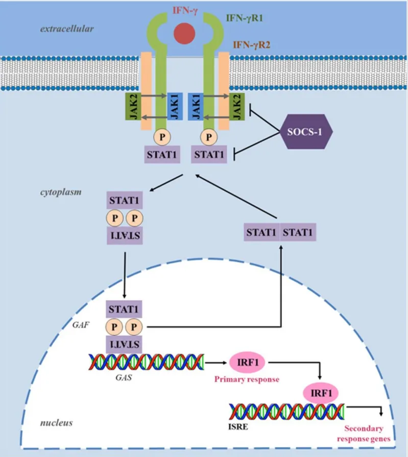 IFN-γ信號通路協(xié)調多種生物反應,在先天和適應性免疫中扮演的重要角色。IFN-γ可以通過促進Th1細胞、CD8+T淋巴細胞、NK細胞、樹突狀細胞及巨噬細胞的活性,抑制Treg、Th2和Th17細胞分化和功能,發(fā)揮免疫調節(jié)作用。此外,IFN-γ可激活巨噬細胞,使其分化為M1型巨噬細胞。