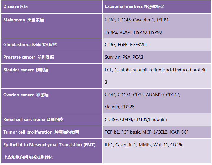 腫瘤細(xì)胞和它們的環(huán)境之間的直接作用之所以在腫瘤發(fā)展進(jìn)程中至關(guān)重要,其中重要的原因就是外泌體在細(xì)胞間信號傳遞中起關(guān)鍵作用。釋放到細(xì)胞外環(huán)境的外泌體可以促進(jìn)血管生成,腫瘤細(xì)胞增殖以及血栓形成,除此之外還有細(xì)胞外基質(zhì)的重塑。下面表格中列舉了常見腫瘤的一些外泌體標(biāo)記。